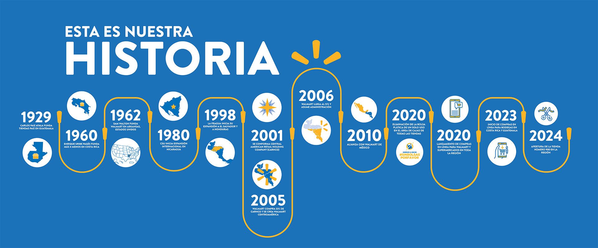 - 2006: Walmart Stores obtiene el 51% de Carhco y asume su administración. Cambia su nombre a Wal-Mart Centroamérica.