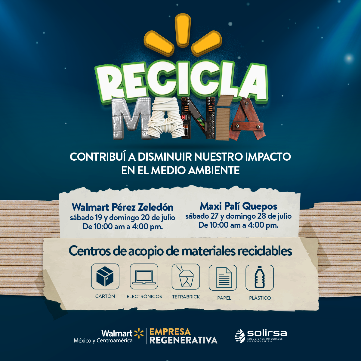 Esta iniciativa orientada a recolectar materiales reciclables como papel, cartón, plástico, envases de Tetra Pak y residuos electrónicos se llevará a cabo los días 19 y 20 de julio en el Walmart de Pérez Zeledón, así como en Maxi Palí Quepos el 26 y 27 de julio.