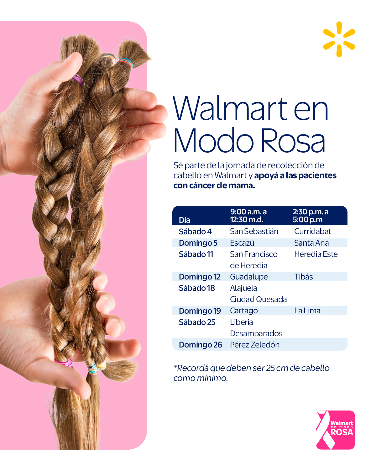 Durante los fines de semana de octubre, en las 15 tiendas Walmart a nivel nacional, un grupo de estilistas estarán realizando el corte de cabello a quienes deseen participar en esta noble causa. Además, si algunas personas prefieran hacerlo por su cuenta, podrán dejar su donación de cabello en el contenedor habilitado en el área de servicio al cliente, disponible en el horario regular de la tienda.